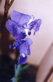 AAN DE RECHTERKANT STAAN LIEFST VIJF IRISSEN MET DAUWDRUPPELS EN TWEE TRIANGELS